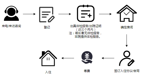 入住时,住养长者和托养人需持相关缴费凭证,携带必要的生活物品、在服药品、医保卡等入住,事前应通知院方入住时间。若长者行走不便、亲属无护送能力的,可委托本院派车上门迎接。